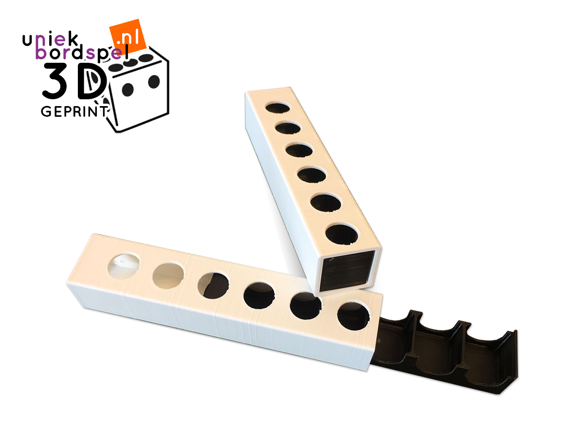 Standaard worden de dobbelsteen containers gemaakt met ons Uniek Bordspel logo voor 5 dobbelstenen. Kies een andere variant indien je een versie zonder logo wil of een eigen logo/naam. Indien je een eigen logo of naam wenst dan nemen wij na bestelling hier contact over op.