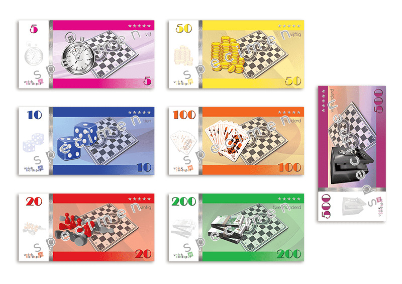 De biljetten zijn op één kant bedrukt, zonder valuta waardoor dit voor verschillende spellen te gebruiken is.